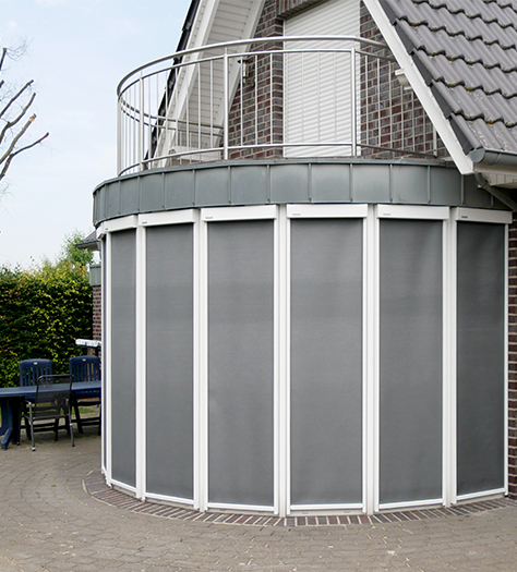 Choose from either oblong, square or round cassette shapes for the curtain roll housing and various shaped channels, guides and brackets for the installation and structural surrounding integration. The fabric curtain is guided vertically using either cables, stainless steel rods or the ‘zip’ system which is the most stable and weather proof system having the fabric actually zipped into the side channels, so no light, wind or rain can get past.