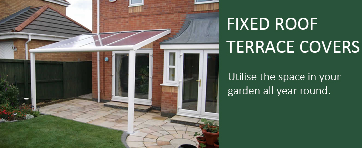 Generally for our UK weather, a fixed roof structure on a framework is the only true way to have all year round protection from our ever increasingly diverse climate. All of our fixed roof canopies and verandas are made from aluminium with either a polycarbonate or toughened glass roof.
