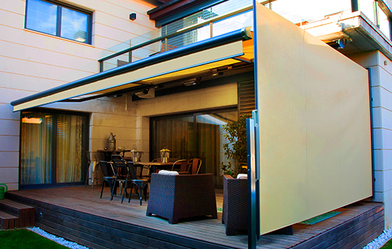 The protection from wind and privacy is offered by any one of our various pull out vertical awnings. Various standard sizes, hundreds of fabric choices and the option to have shaped fabric to follow a pitch of a roof or similar.