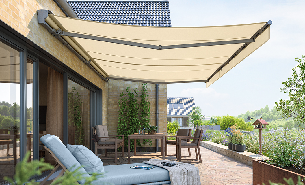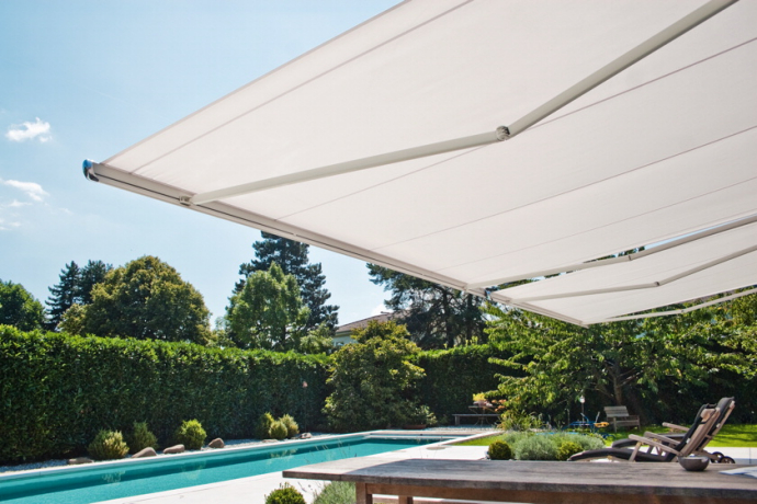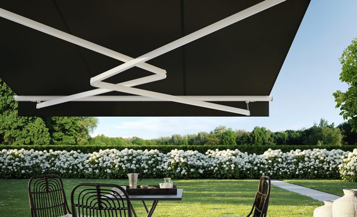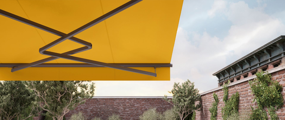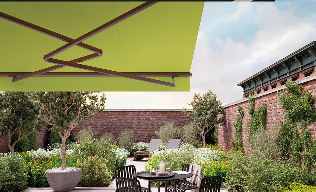 A crossover folding arm set up means you can achieve these greater than width projections, something not possible on any normal folding arm awning. Markilux, Weinor and Lewens have options for awnings developed solely for this purpose and the end result is a marvel of mechanics.