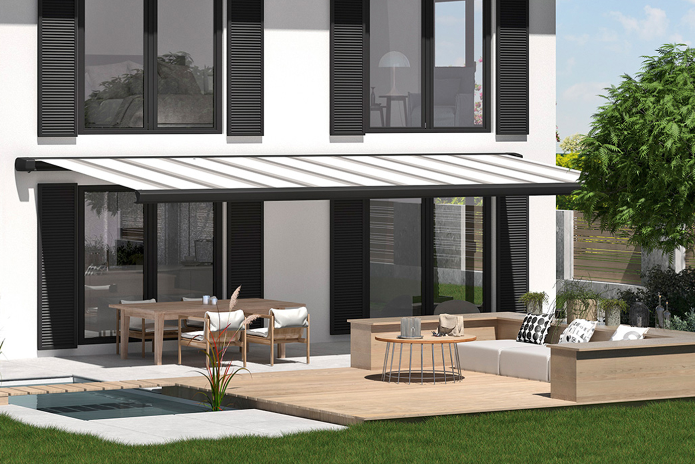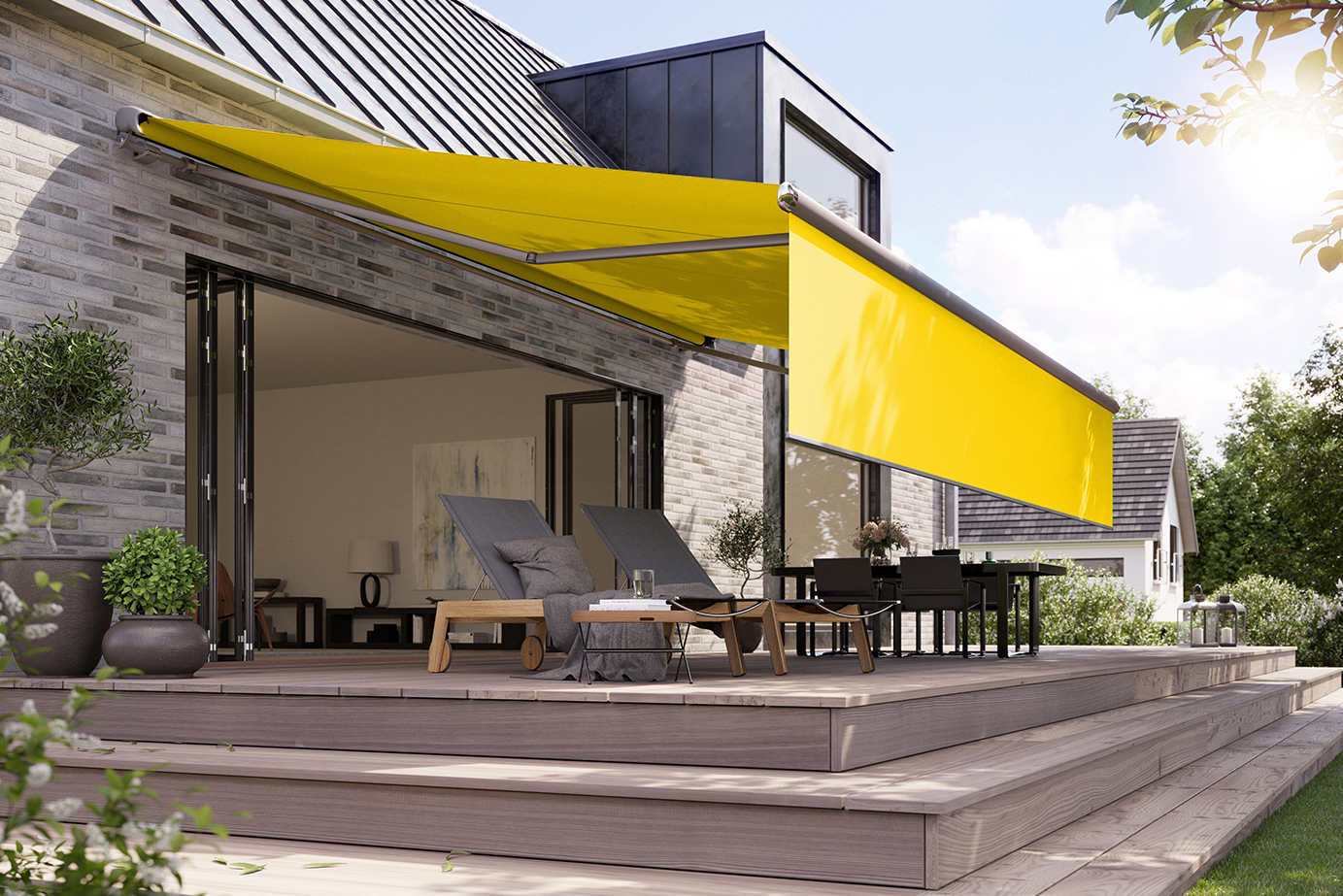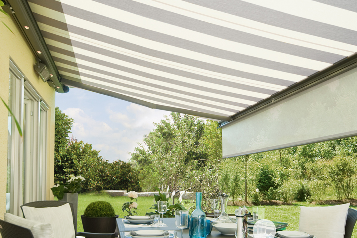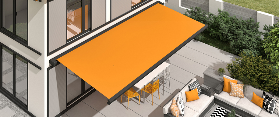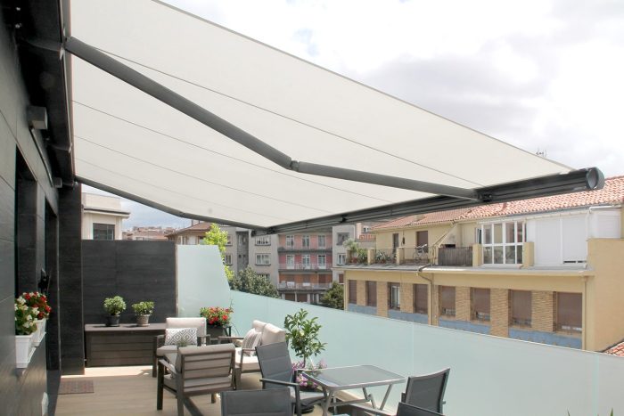 Larger outdoor spaces, where only sun shading is necessary, such as a south facing garden, terrace, patio or maybe a courtyard area, are perfectly suited to larger size retractable folding arm awnings. One main attraction is the ability for the entire fabric cover to roll away neatly when not in use and be protected from the ravages of a UK winter.