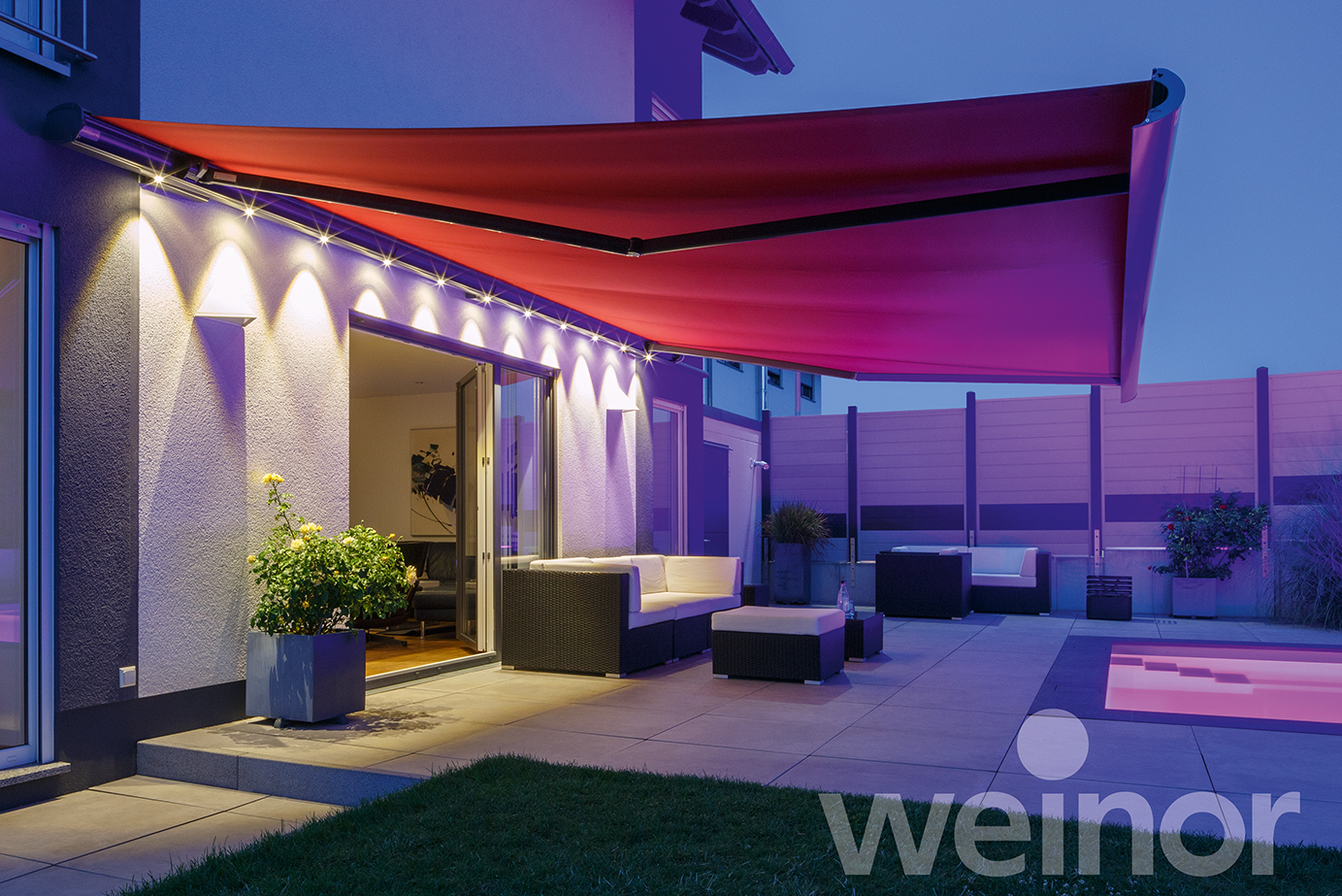 A maximum width of 14 metres with a projection of 4 metres covers a large area indeed and if this was doubled up on a goalpost framework system then you can cover 14m x 8m – or 112 square metres!! All this can retract at the push of a button.