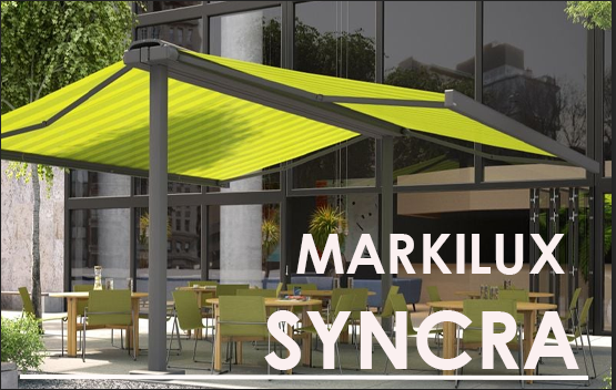 The Syncra frame system from Markilux provides an exceptional aluminum goal post structure to allow the installation of any of the high quality retractable awnings they manufacture, but also the pergola awning ranges too. There is the Syncra “Fix’ and a Syncra ‘Flex’, the ‘Fix’ being a fixed system bolted to the ground on a suitable substrate. The ‘Flex’ is a system using large steel weighted boxes to support the frame and awnings. These ‘Flex’ boxes have to be filled with aggregate and will weigh a lot, but they also double up as either seating or planters.