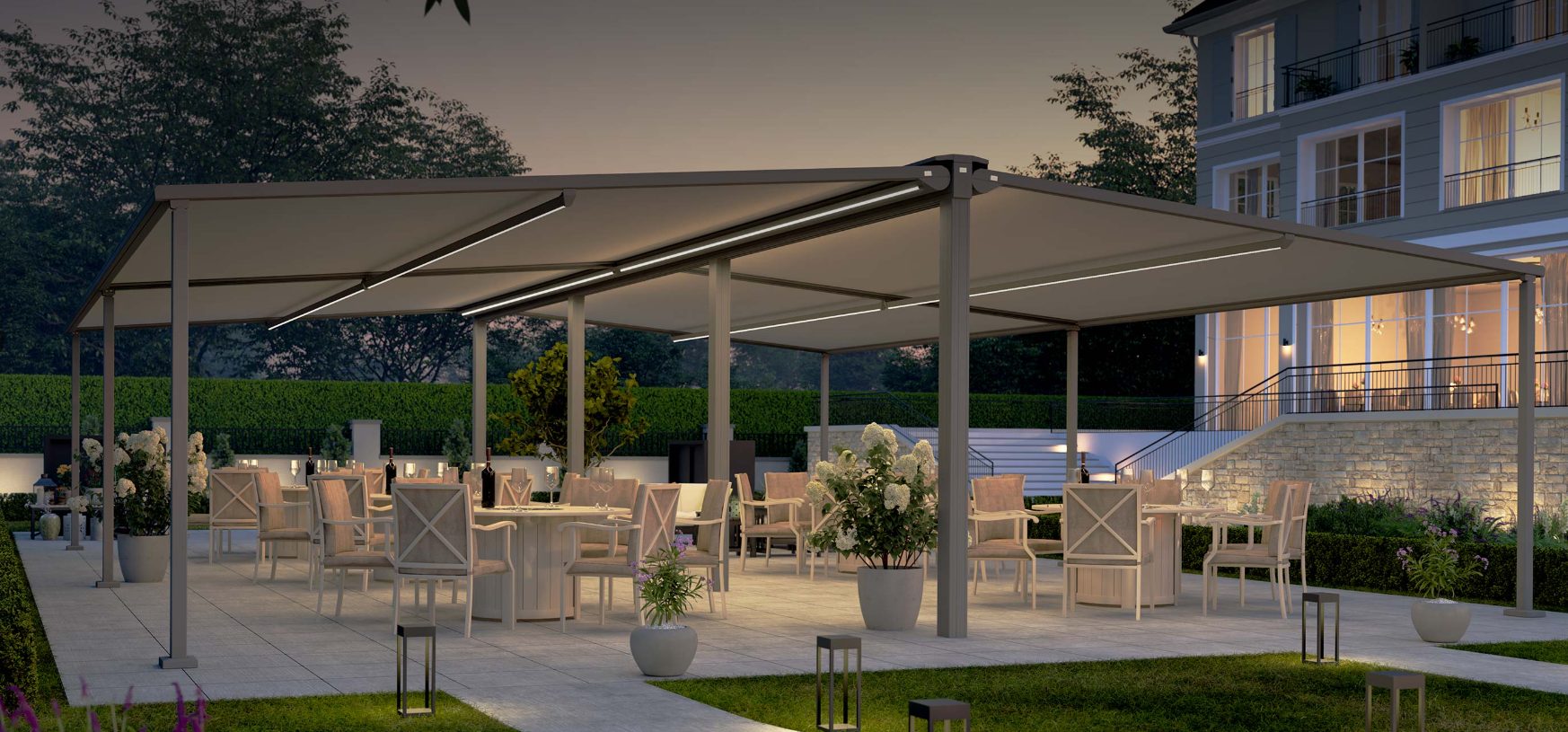 Always using fabric for the roof canopy, these systems offer natural light underneath, depending on your fabric choice and fully retract for open air exposure when required.