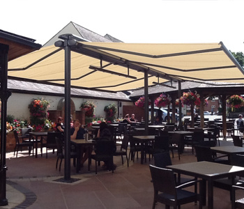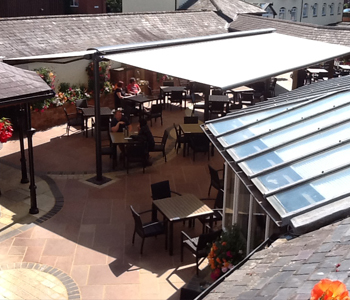 Samson Awnings were asked to provide sun and light rain shelter in an outdoor courtyard area at The Three Swans Hotel which doubled as a public walkway for guests and customers.