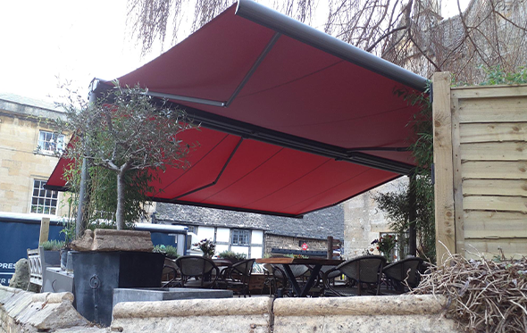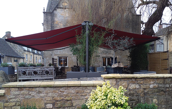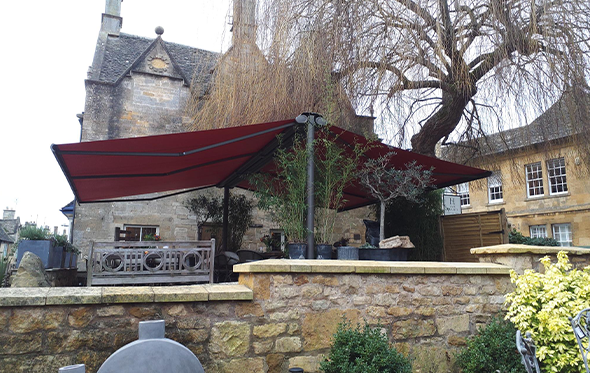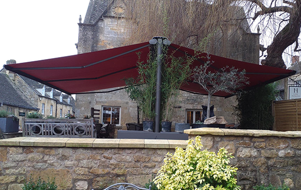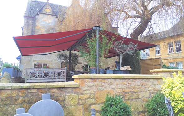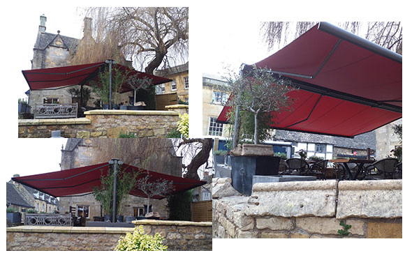 The super strong and table Syncra system offers our customers the chance to cover very large areas with ease. This particular Samson installation in Chipping Camden, Gloucestershire is using 2 Markilux 5010 full cassette awnings each at 7000mm wide and with a 4000mm projection, giving an overall coverage of 56 square metres!!