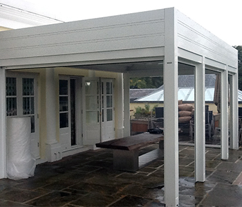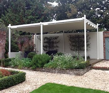 We were invited to provide a retractable roof in the beautiful Victorian walled garden of this venue for garden parties and outdoor entertaining. The Gibus Med isola fly was chosen to provide the correct aesthetic whilst delivering the highest level of weather protection. The result is self-evident. In addition to the garden Med isola fly, our client required the more sophisticated Med Room on the Terrace area. The purpose was to create an outdoor eating area which could also protect from the elements when necessary. Transparent zipped vertical blinds helped to provide a sheltered environment whilst maintaining the al fresco feeling. The waterproof retractable roof enables protection from the heaviest rainfall when deployed and allows enjoyment of the sun when open. The in-built guttering and drainage system through the legs promotes efficient movement of water whilst being aesthetically invisible.