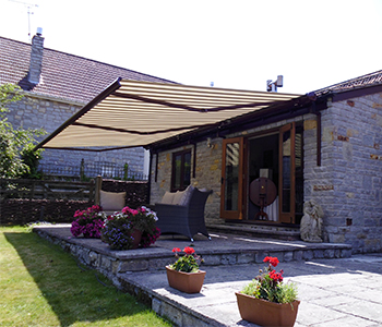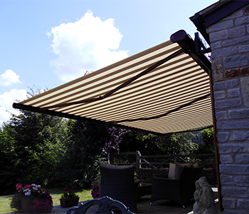 The client wanted to keep the awning looking as traditional as possible to blend in with the beautiful old stonework on her barn conversion so she opted for the framework to be powder coated in special RAL 9016 (Mahogany brown) to match the timber cladding on the property. The customer then choose a complimentary bold striped fabric (Sunsilk 31327) which finished off the installation nicely.