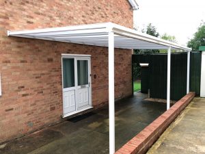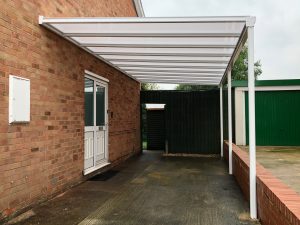 A recent installation, this polycarbonate carport installation shows another use for the increasingly popular Samson P16.The P16 is one of our most popular systems and it’s versatile nature and minimalist looks means it suits a variety of purpose and properties. With a projection of 3.5 metres, and a length of up to six metres, this system is ideal for a carport, which it was used for in this particular case, to protect both the car and the area outside of the door of the home from adverse weather such as heavy rain, hail or even snow. Constructed entirely from aluminium, the P16 offers fantastic longevity and all the fixings are 316 marina grade stainless steel, designed for total corrosion resistance. The system was specifically designed to fit between the house and the small brick wall on the edge of the drive, and finished in a simple white colour to match the doors and windows of the house, this system looks completely natural as part of this home.