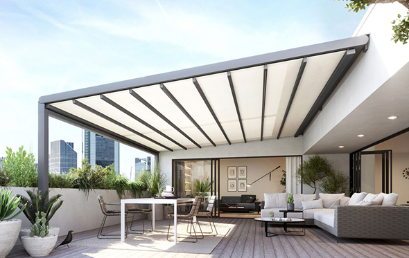A wide range of sloping or flat roof structure pergolas with retractable, outdoor specification fabrics. The most basic systems just slide back and forth with a pulley system and can be manual or electric operated.