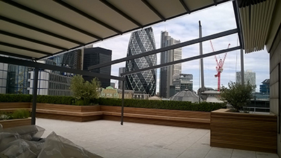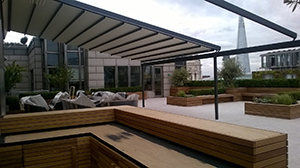 Samson Awnings have just completed the roof top installation of a Weinor Pergotex system on the 7th floor of an office block in central London. Due to the high and exposed location the Pergotex was chosen as it has a tested capability to deal with winds up to Beaufort scale 8 and with the PVC cover coupled with lateral support bars the system has a high level of fabric tension enabling it to withstand heavy rainfall too.
