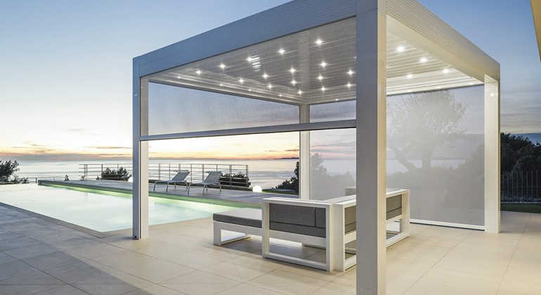 The system has a roof similar to that of the Med Twist, with aluminium blades that twist and rotate. They open up to an impressive 135°, and can be adjusted to provide just the right amount of shade or heat. When open, the blades create a natural airflow that feels like being outside, yet when closed, the blades form a full roof, with a watertight seal that prevents occupants underneath from getting wet. Rain water is dealt with via an internal guttering system.