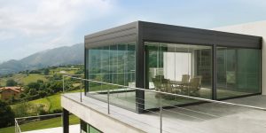 This system can even have drop awnings fitted onto the side, with minimal intrusion on the design, up to 4 metres wide. The shading options vary, from total blackout blinds to crystal, all of which can be motorised.