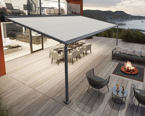 The Pergola Awning is a high specification product which has evolved for many years now to be a definitive solution for larger outdoor areas, specifically for the greater projection from the wall mounting. It is a fabric awning system which extends and rolls out from a cassette housing, but also runs in guide channels either side, with supporting posts at the front.