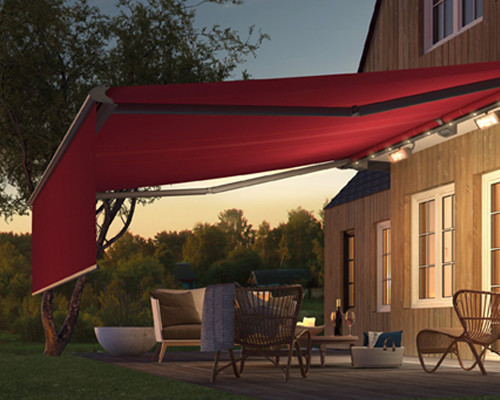 You have an awning for protection from the sun and heat, but many people also want protection from light rainfall too. If you do want the awning for light rainfall protection then you are best with certain models which have stronger and larger arms to be more stable too. The biggest criteria however is the awning has at least 15 degrees of pitch on the fabric canopy when extended to make sure the rainwater flows freely and quickly off the cover.. You need an awning which can be adjusted to 15 degrees or more pitch and has the most stable arms and overall build. For sun shade protection then this depends on how much sun you want to block out. Obviously very dark fabrics will block out more light and UV rays generally and very light fabrics can actually act like a diffuser with sunlight to stop the glare but spread out the light better underneath. If you are south facing and don’t like the sun’s heat, UV and brightness then go darker on the fabrics, otherwise there is a massive choice generally of over 200 fabrics per brand we offer. Drop down valances at the front are an option to provide additional shade against low lying sun and also provide privacy and protection from cool breezes. LED lighting is readily available in various forms and positions on many of our awnings and allows you to go into the evenings with the awning. If you choose LED lighting on the cassette then the awning can double up as a large wall light even when not is use as an awning. Smart app controls are readily available now on most of our electric operated awnings with Somfy electric drive motors. These apps allow you to operate the awning from literally anywhere in the world to assist in keeping rooms cool. Make them operate themselves from sensors too and protect themselves in high winds or even rain, closing automatically if you are not around.