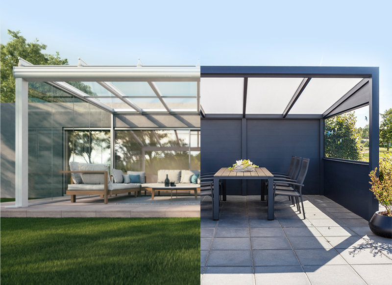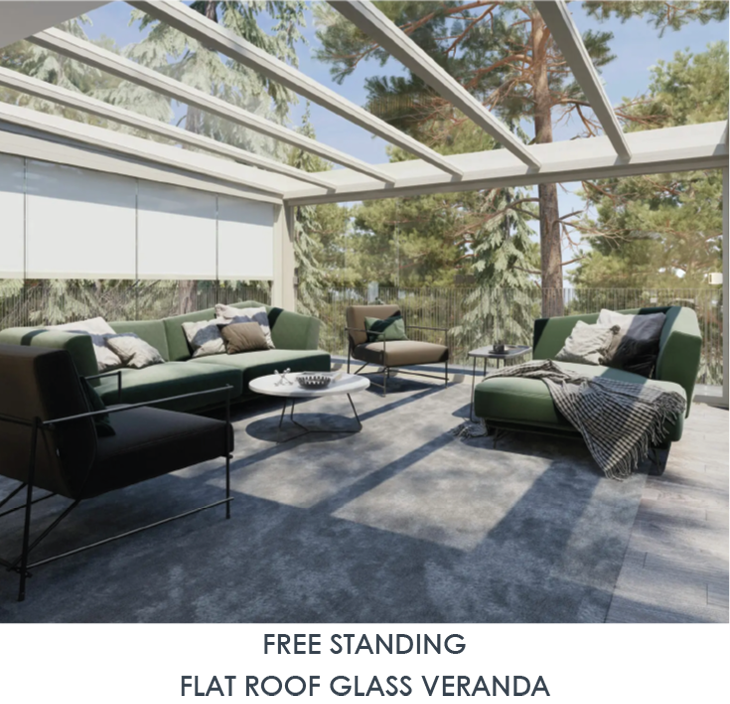 You primarily have sloping, wall mounted glass verandas (mono pitch), flat roof wall mounted models and then also free standing, flat roof models.