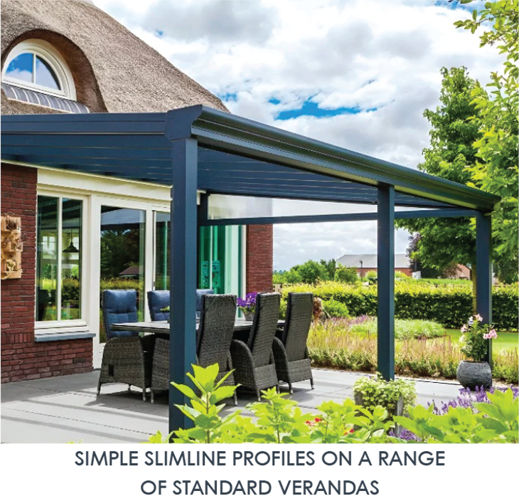 You can also have gable roof design options as wall mounted or free standing and verandas fitting around the corner of your building if required.