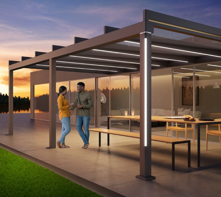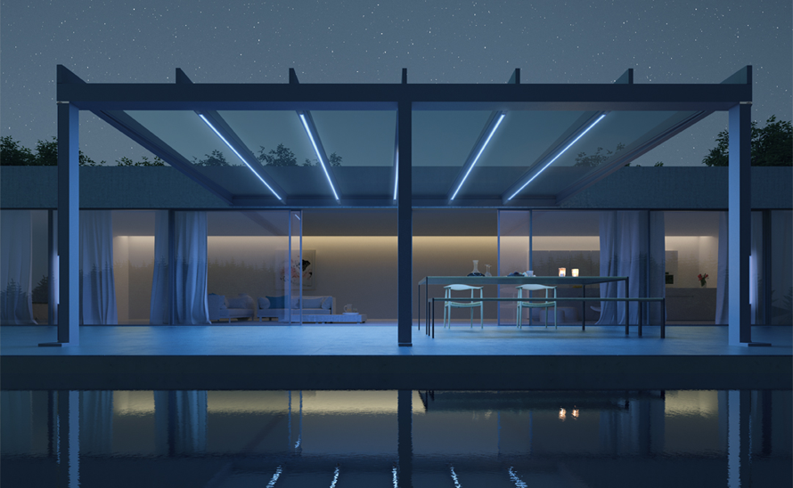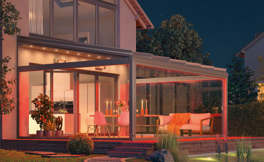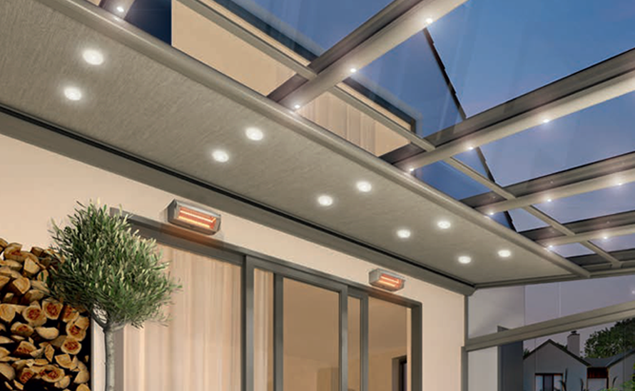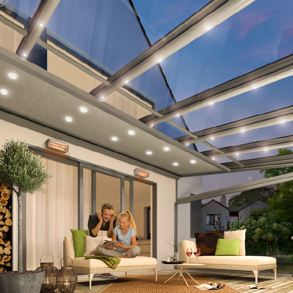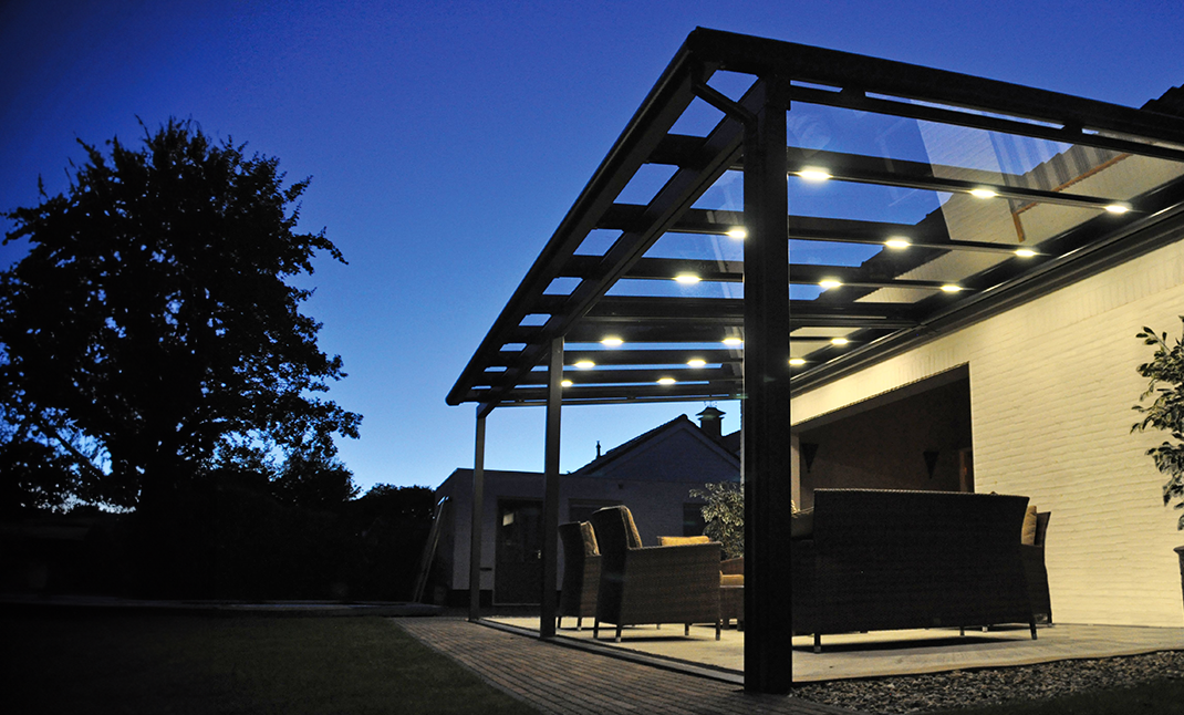 A glass veranda is a perfect outdoor solution for the evening time. With built in LED lighting you can simply light up your outdoor area and create a welcoming atmosphere to spend more time underneath. Add LED lighting and one or more infra red halogen heaters and you could find many extra weeks or months of the year outside with rain showers being a spectacle to enjoy rather than driving you inside your home.