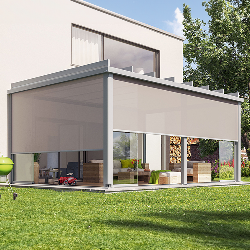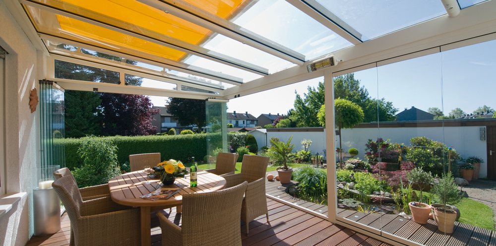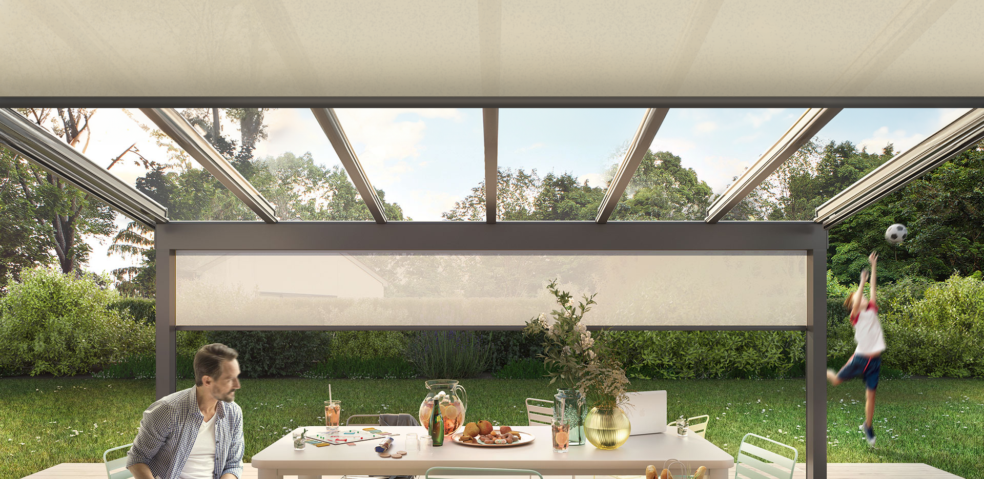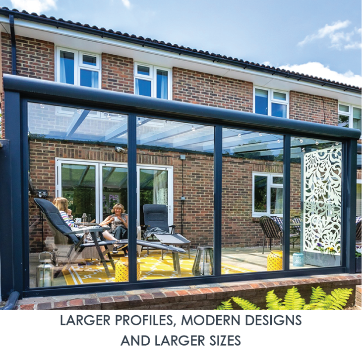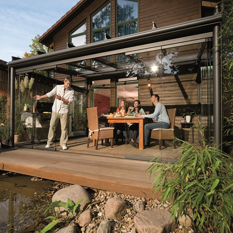 Most gardens or patios will have an annoying prevailing wind which is more noticeable and relevant in the evenings or cooler months of the year. Some aluminium verandas are designed to be able to retrofit additional products to the front and sides to further offer wind, sun and rain protection when required. Products such as sliding glass walls, electric vertical fabric blinds, solid glass panels, louvred walling and other products.