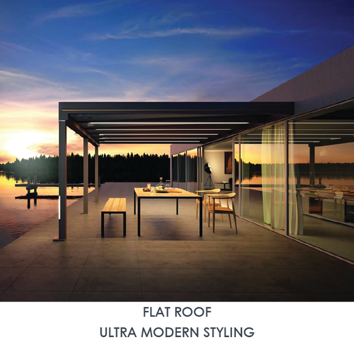 Our newest flat roof veranda system is very popular as it fits the design of so many more modern homes and also doesn’t require the height at the wall mounting point that sloping lean to systems required.