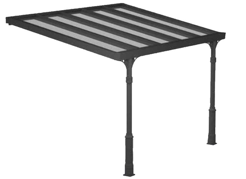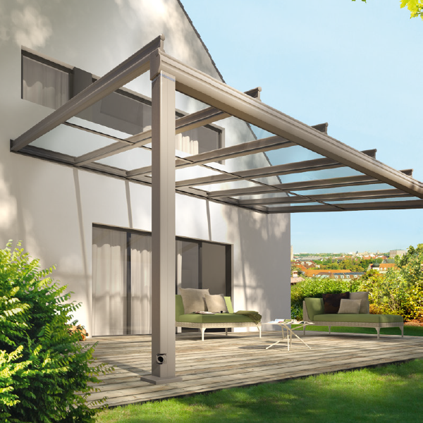 A free standing unit will be more limited in the sizes, but is also presented as a flat roof system as standard, so can have side elements easily added for extra weather protection.