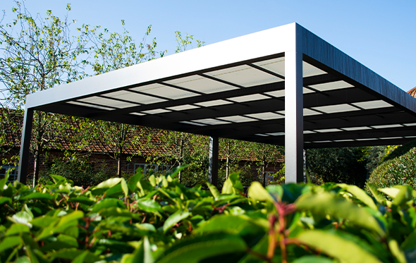 A large commercial grade aluminium structure with 2 independent retractable fabric roof systems built in the Markant offers a lot of coverage with just 4 posts. Up to 6m x 6m.