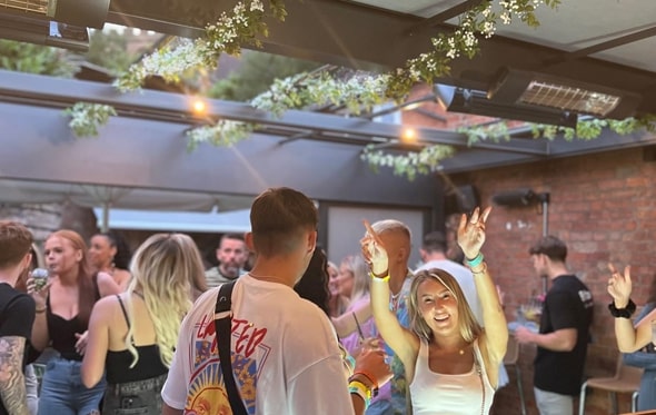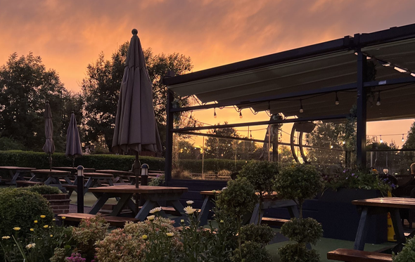 A standalone aluminium frame structure with 2 electric retractable fabric roof systems using a concertina system and covering 8100mm x 7200mm for a perfect covered outdoor area in a busy pub and restaurant in Derbyshire.in all year round.