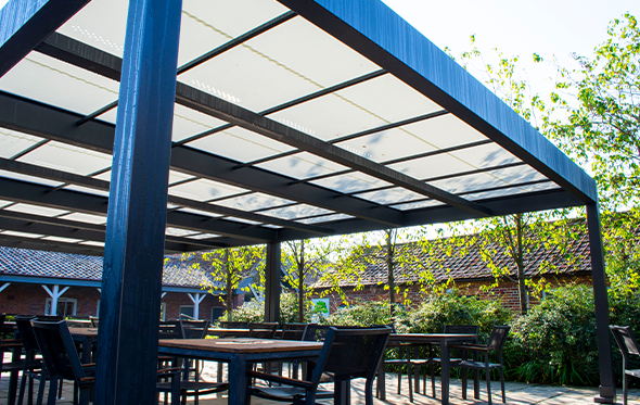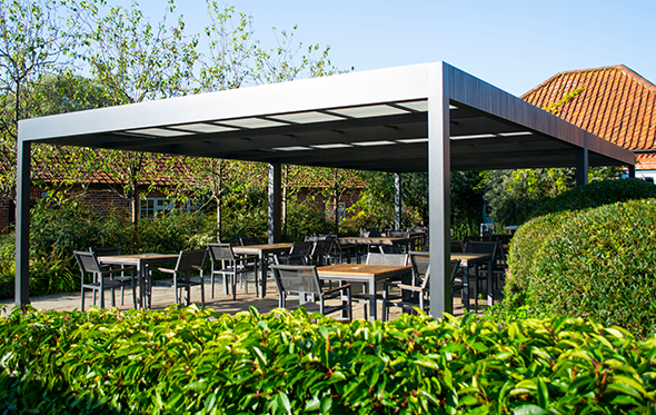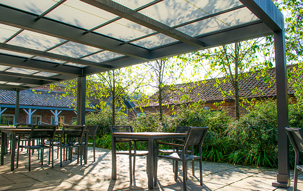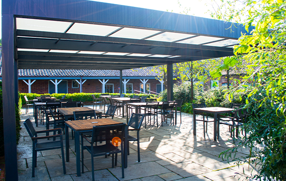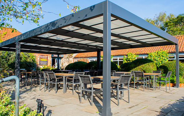 With this in mind, we surveyed and specified the Markilux Markant retractable roof for its excellent ability to provide year-round weather protection, with compelling, aesthetically pleasing results. The Samson team expertly installed the bespoke, free-standing system, measuring 11m x 6m, in the Courtyard Cafe.