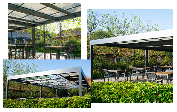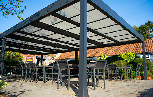 It was important to specify a style that complemented the environment and natural surroundings. The cafe itself is lined with beautiful stone buildings, traditional features of the local area, and an endless variety of trees and plants. With the cafe soon to be decorated with freshly painted timber of a dark-grey colour, the system was finished in an Anthracite Grey framework to suit, along with its uncompromising ability to lend itself to any future colour scheme.