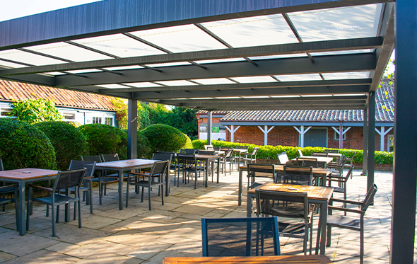 Whilst the existing cafe was set in a charming space, it was typical of many outdoor areas found in the UK. Whilst it offered some tables and umbrellas, this realistically only provided some shade for one side of a table. In this situation, only two customers at a four-seater table can benefit from the umbrella, with no worthwhile protection or comfort in this area of the cafe during any rainfall.