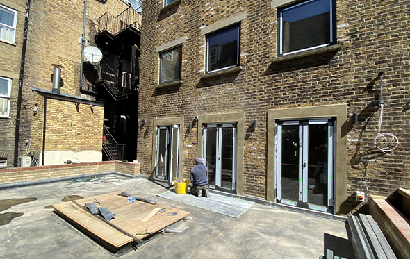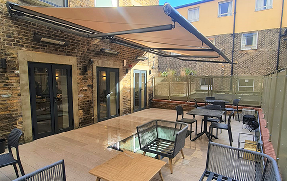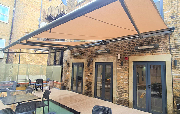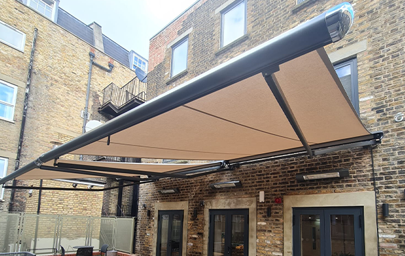 The unique Markilux 1600 Stretch with a projection greater than the width with 3 no. Markilux IO controlled infra-red heaters for a terrace area in Camden, London