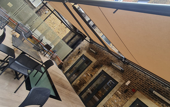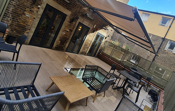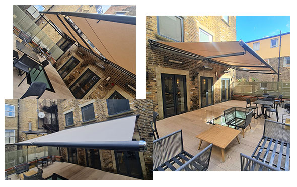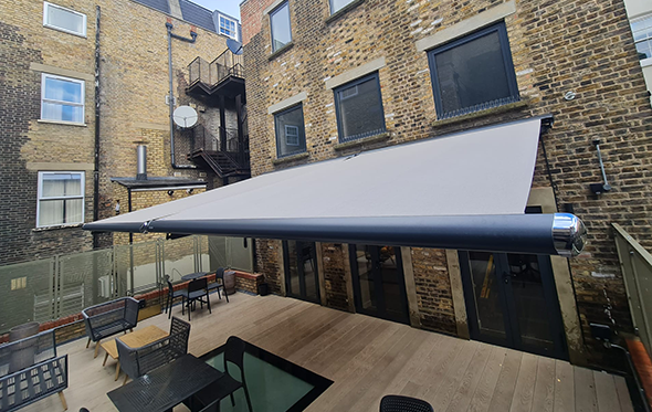 We were approached by the Future Dreams Charity for a solution to some outdoor seating on their London terrace and offices. Due to the shape and size the best solution to have something totally retractable but able to provide good levels of shading was the Markilux 1600 Stretch awning.