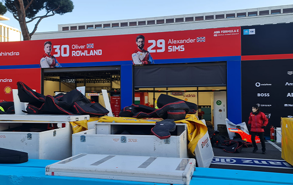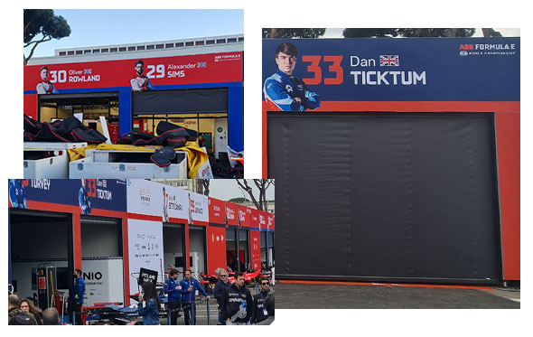 Samson Doors were approached by The Halo Group to propose solutions for multiple door openings to be used on their steel structures for the Formula E 2023/24 racing series. This series goes around the world just like Formula 1 but requires an almost pop up solution approach due to the nature of the racetracks used and their variance in different countries. It turned out quite quickly that the solution perhaps was not a roller door from Samson Doors in the traditional sense, but a roller blind, specifically designed for outdoor use from Samson Outdoor Living. The Markilux 779 external vertical fabric blind is a product designed to block sunlight and provide shade but is also extensively used on the Markilux outdoor structures to close off open sides and prevent sun, wind and rain ingress, the fundamental need for this project. This fact alone made it a contender for a solution for the openings on the Formula E race team enclosures and workshops during the race.