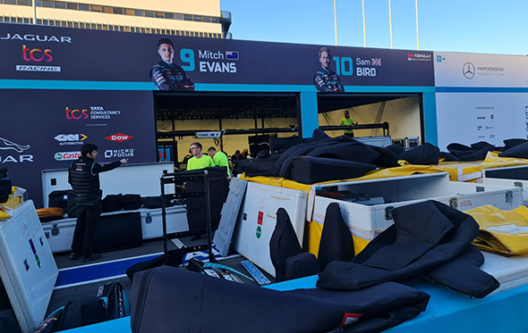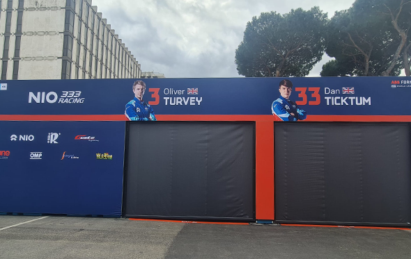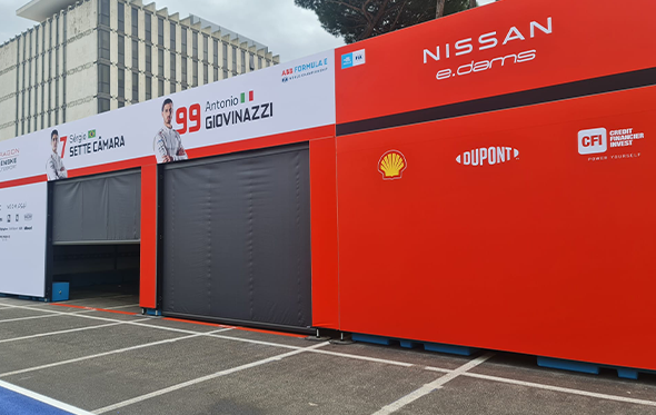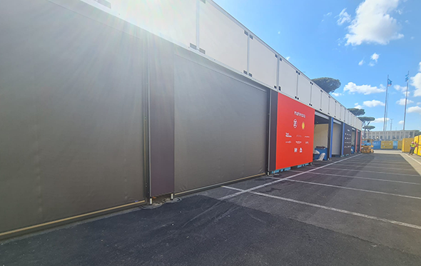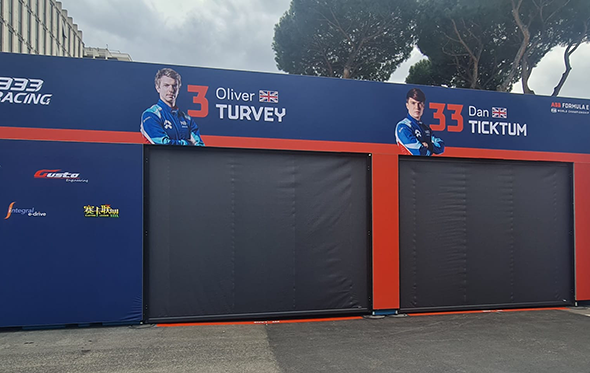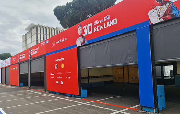 Samson Doors were approached by The Halo Group to propose solutions for multiple door openings to be used on their steel structures for the Formula E 2023/24 racing series. This series goes around the world just like Formula 1 but requires an almost pop up solution approach due to the nature of the racetracks used and their variance in different countries. It turned out quite quickly that the solution perhaps was not a roller door from Samson Doors in the traditional sense, but a roller blind, specifically designed for outdoor use from Samson Outdoor Living. The Markilux 779 external vertical fabric blind is a product designed to block sunlight and provide shade but is also extensively used on the Markilux outdoor structures to close off open sides and prevent sun, wind and rain ingress, the fundamental need for this project. This fact alone made it a contender for a solution for the openings on the Formula E race team enclosures and workshops during the race.