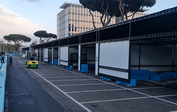 An unusual but not so unusual use of external vertical electric blinds for the Formula E race teams and their race enclosures during races around the world.
