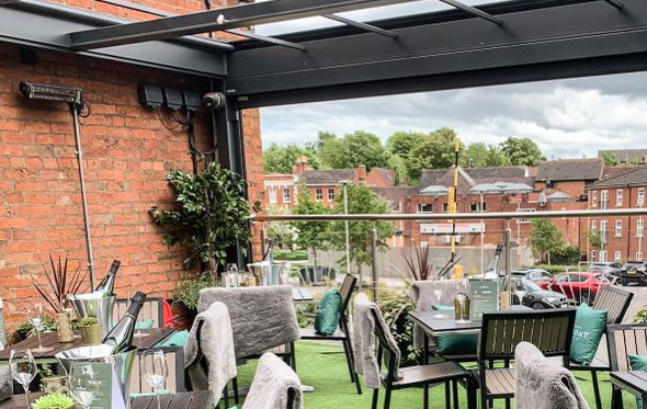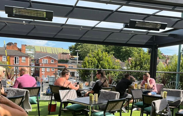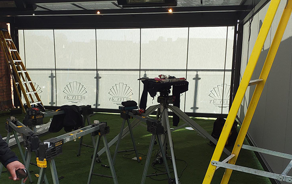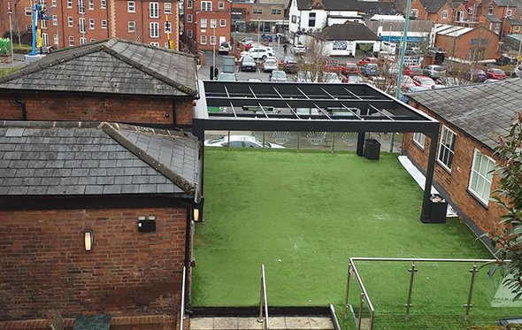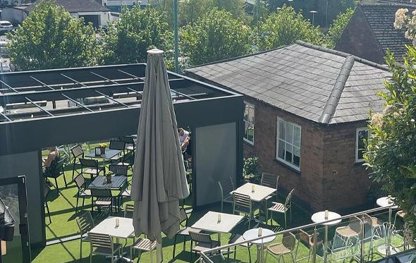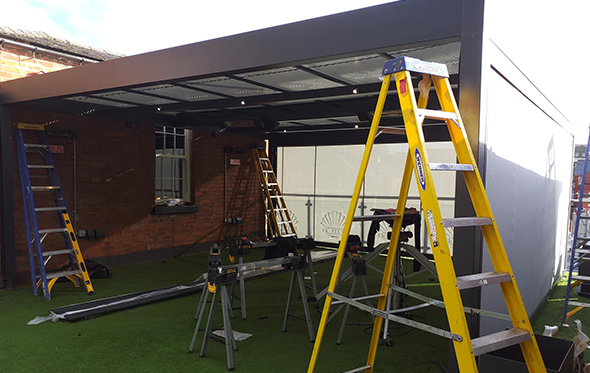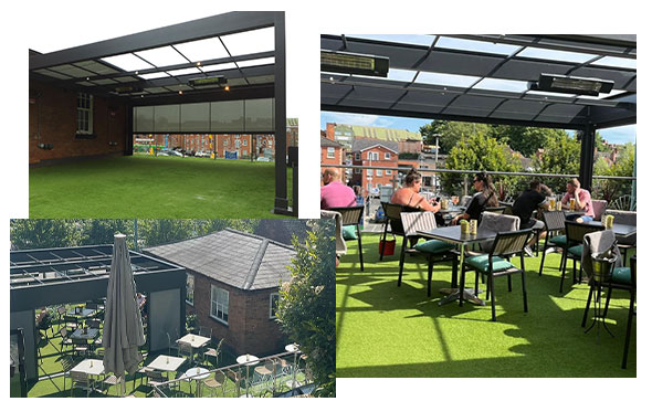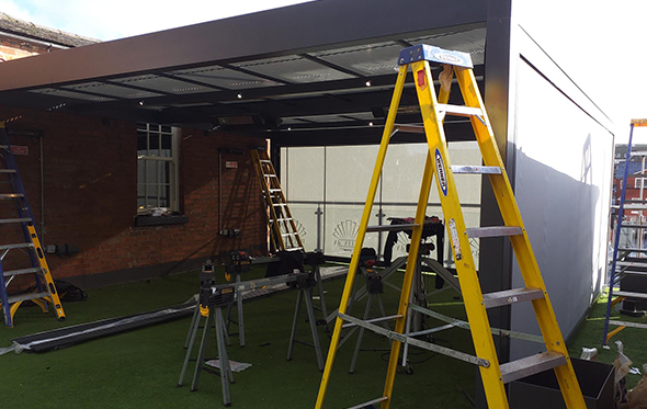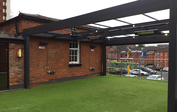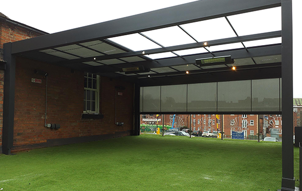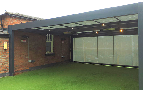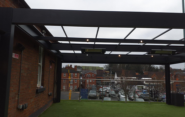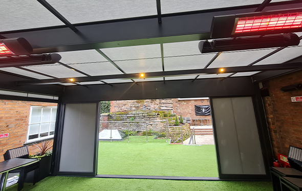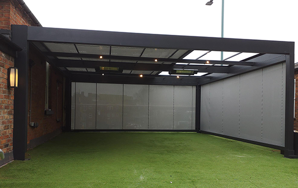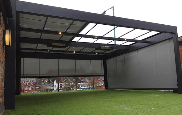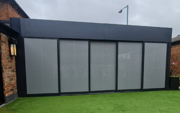 This structure was built during the pandemic and was to provide a lot of additional covered outdoor space for customers of a very popular wine bar in Bromsgrove, Birmingham. The system was built with a partial free standing fixture system as the roof it sat on could not be tampered with using any fixings downwards. One side was secured against the existing building and the opposite 2 posts were using bespoke weight boxes. The system has LED lighting and infra-red heating incorporated for maximum use during the year and especially in the evenings. 2 vertical zip fabric electric blinds are built in to provide protection to 2 sides and the remaining side used the Markilux Format sliding fabric door system giving the ability for partial opening but access still possible for pedestrians coming in and out.