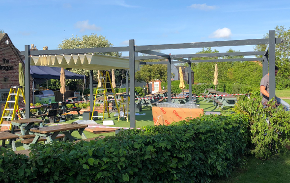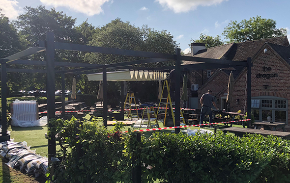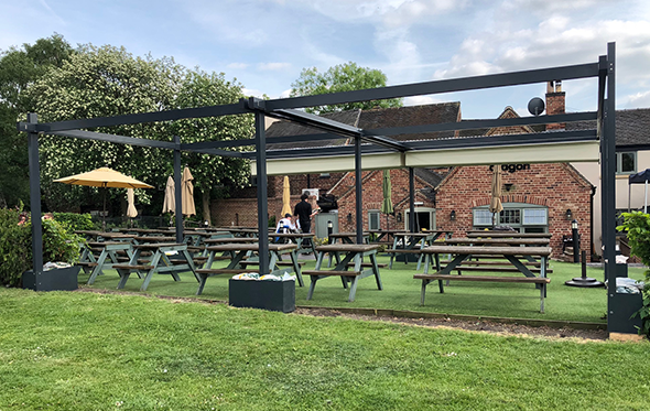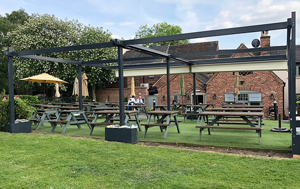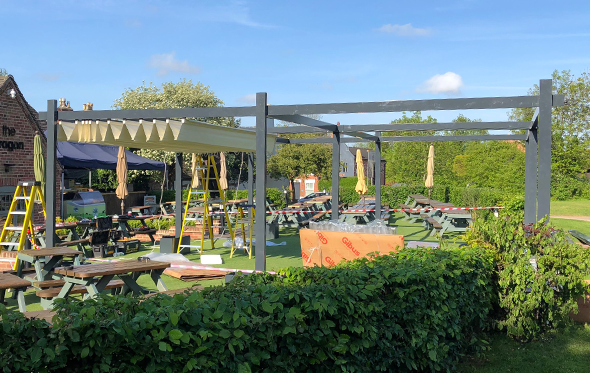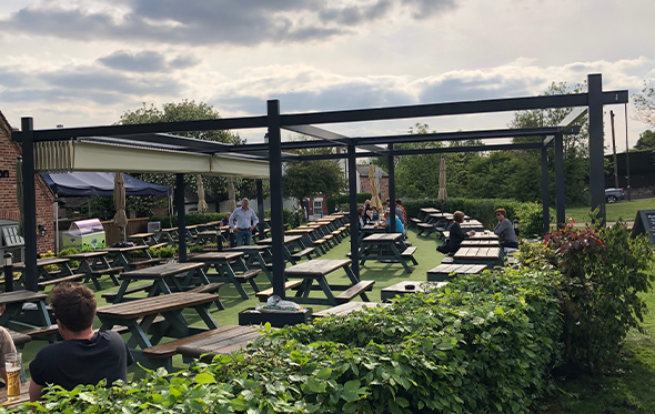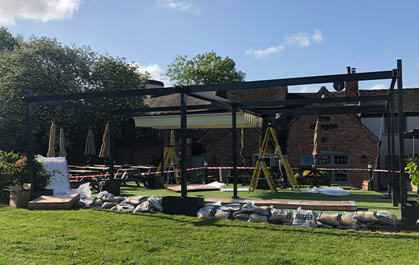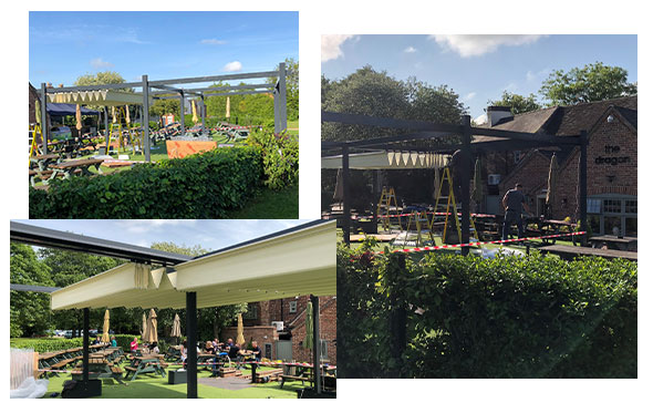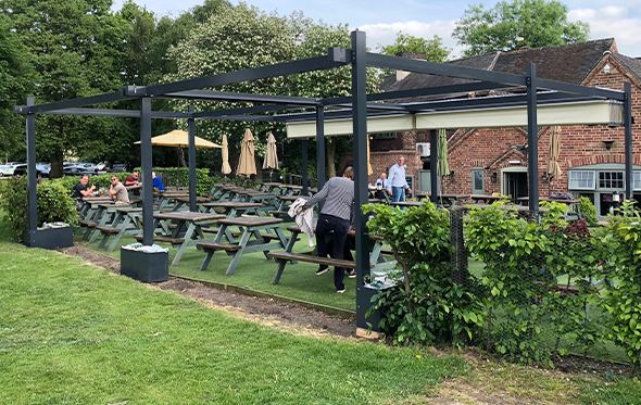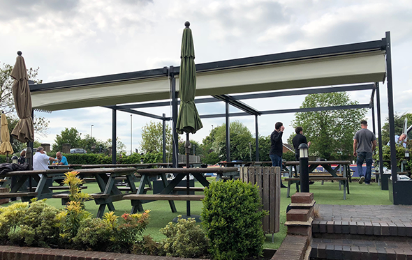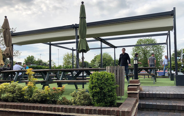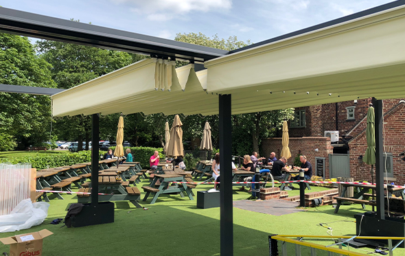 A standalone aluminium frame structure with 2 electric retractable fabric roof systems using a concertina system and covering 8100mm x 7200mm for a perfect covered outdoor area in a busy pub and restaurant in Derbyshire