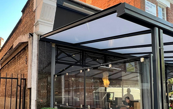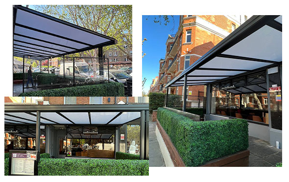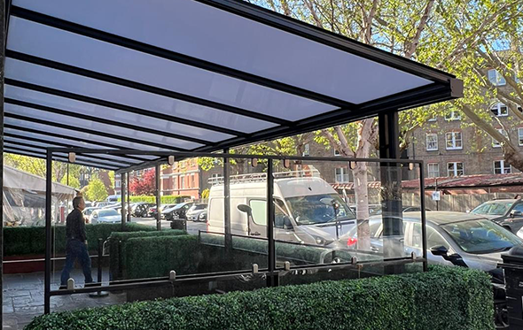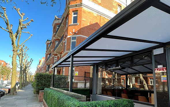 Fixed polycarbonate aluminium veranda system by Samson at 10m wide to create additional covered space outside a busy Maida Vale London restaurant. Perfect protection from the rain and additional light sun shading by the use of opal polycarbonate glazing.