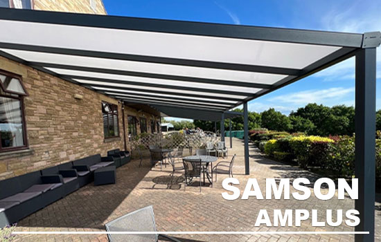 Samson Outdoor Living were approached for a solution to cover the external area in front of a restaurant in London primarily for weather protection. Natural side protection from wind and rain already existed with bushes and glass balustrading. Our Samson P16 veranda was chosen as one of the best solutions here. The system is limitless in its width and the width here was 10m with a projection of just under 3m. The aluminium framework is in an anthracite Powdercoat final finish and the multi layered polycarbonate roof was chosen in an opaque finish to provide sun and glare protection as well as the obvious rain protection all year round. The rainwater falling on this canopy is collected in the front profile guttering and taken down some or all of the support posts to be driven away at low level away from the protected area. This building previously had retractable fabric awnings. but their pitch was not sufficient to deal with rainwater effectively. This new Samson canopy system can deal with heavy rain and even has a snow load rating too.