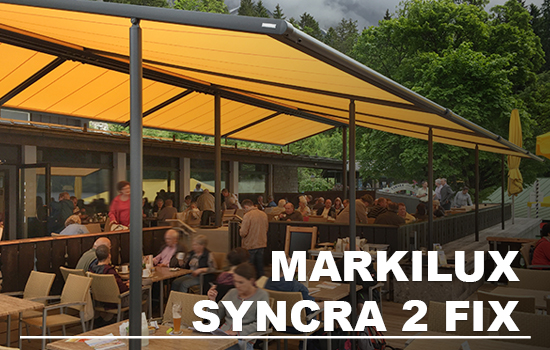 The super strong and table Syncra system offers our customers the chance to cover very large areas with ease. This particular Samson installation in Chipping Camden, Gloucestershire is using 2 Markilux 5010 full cassette awnings each at 7000mm wide and with a 4000mm projection, giving an overall coverage of 56 square metres!!