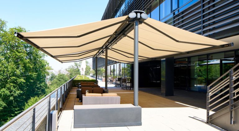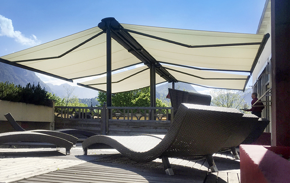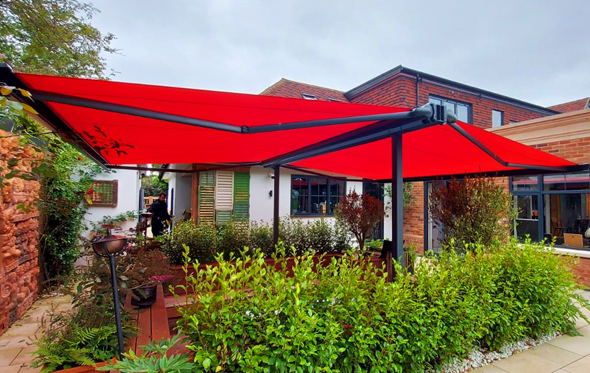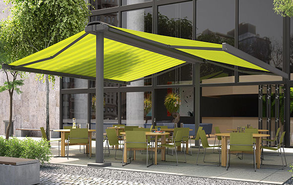 For most commercial applications in the UK the requirement is not only for sun protection but also to provide shelter from the rain. This is where the Markilux Syncra system is ideal as many butterfly awnings are only suitable for sun protection and do not have the strength to be used in wind and rainy conditions.