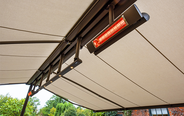 A wide choice of accessories can be added to the Syncra framework, including LED lighting and infrared heating systems enabling use of the cover during the evening and with additional warmth to extend the evening al fresco experience. Drop down electric or manual operated valances can also be specified with certain models to give further protection at the sides and Samson can also supply fixed side sections either in glazed or solid sections to create a more protected environment to encourage use of the area.