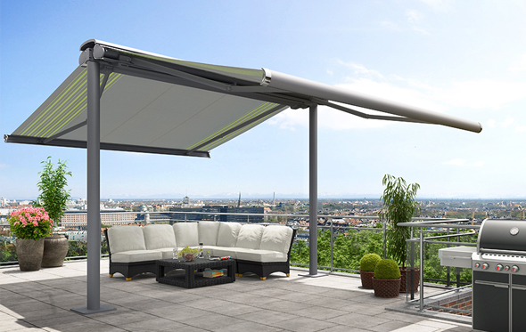 The free-standing awning stand consists of a steel cross member and two steel posts at the side and has no annoying centre support like giant umbrellas can have. It offers plenty of space with a maximum height of three metres and a walk-under height of over two metres to side even at large extensions. Seven different awning models from the Markilux range are available to suit different requirements and tastes. Whether small and compact or stylish and elegant, with or without lighting. All awning types are equipped with a gear mechanism and attractive stainless steel winding handle; an electric motor is optional. The powder-coated awning stand includes a top profile in the same frame colour as the awning. The cover and mechanism are always well protected when retracted by the totally enclosed housing and top profile.