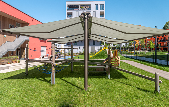 The Markilux Syncra system is constructed from a strong galvanized steel box section framework available in one piece up to 7 metres wide or as a coupled unit up to 13.9 metres wide. Combine this maximum size with 4 retractable awnings with 4 metre projections and you can cover an incredible total area of 111 square metres! The system is tested and CE approved.
