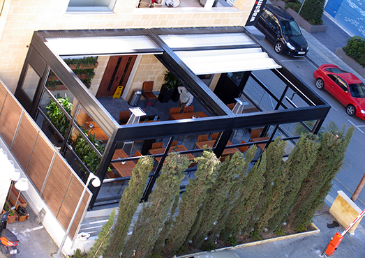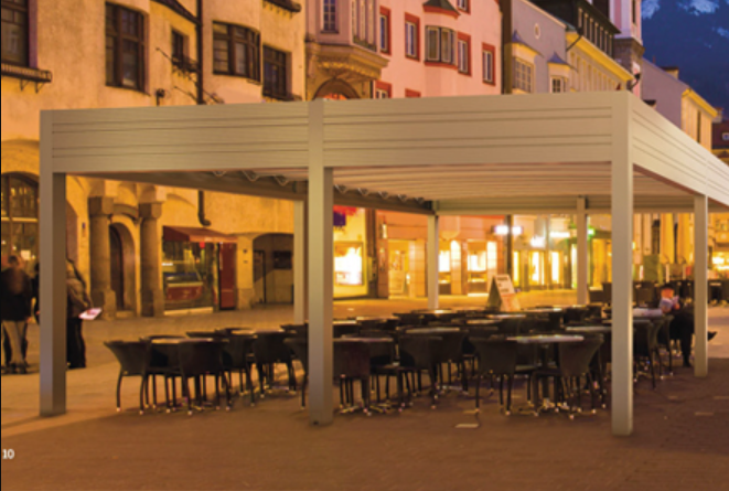 The Gibus Med Room is a highly weather resistant commercial application for large outdoor areas with a retractable fabric roof. The Med Room can be leaning and attached to a building or as a self-supported stand alone structure. Most commercial applications vary from house buildings and have very challenging variations in building shapes, fixing points and roof heights. It is rare to have a totally flat brick wall to insert onto with a commercial building which is why the Med Room is developed with self-supporting in mind. The aluminium framework support posts create the basis for the overall structure and the retractable fabric canopy is a tough, durable vinyl coated fabric that varies from a simple retractable cover where the rainwater will fall off the sides of a sloping cover, or, a fully enclosed fabric system where the rain water is channelled into a built in guttering system directing the water around the framework and down one or several of the supporting legs to drain out at low level.