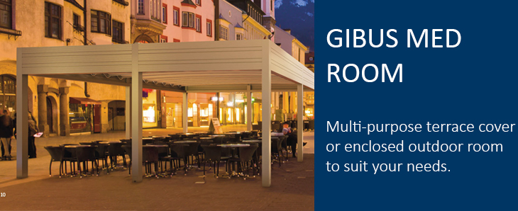 The Gibus Med Room is a highly weather resistant commercial application for large outdoor areas with a retractable fabric roof. The Med Room can be leaning and attached to a building or as a self-supported stand alone structure. Most commercial applications vary from house buildings and have very challenging variations in building shapes, fixing points and roof heights. It is rare to have a totally flat brick wall to insert onto with a commercial building which is why the Med Room is developed with self-supporting in mind. The aluminium framework support posts create the basis for the overall structure and the retractable fabric canopy is a tough, durable vinyl coated fabric that varies from a simple retractable cover where the rainwater will fall off the sides of a sloping cover, or, a fully enclosed fabric system where the rain water is channelled into a built in guttering system directing the water around the framework and down one or several of the supporting legs to drain out at low level.