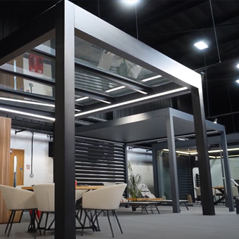 Samson operates one of the UK’s more comprehensive outdoor living showrooms at its Wellingborough base, with multiple full‑size working pergola and canopy systems on display.