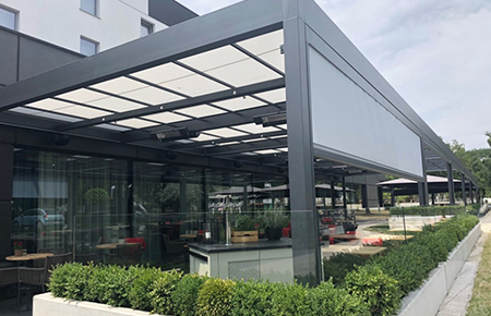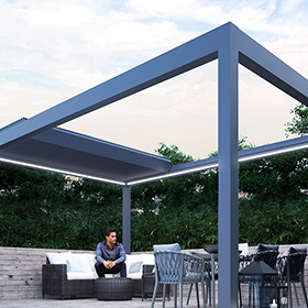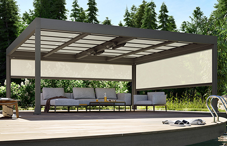 We can offer solid aluminium structures with retractable fabric and bladed roof systems. These have very high wind ratings. The side infills vary from sliding glass walls, external vertical blinds, rotating aluminium louvres and solid aluminum panelling.