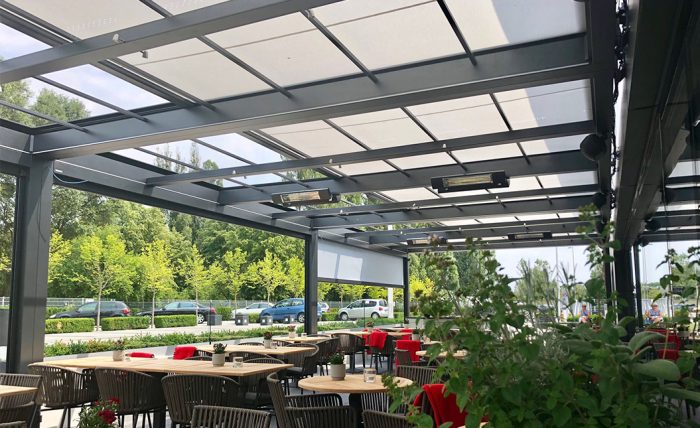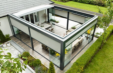 Our stand alone retractable roof structures offer ultimate flexibility in positioning with self supporting posts and a finished structure capable of additional side infills to suit and further enhance the weather protection. Glass sliding walls and doors, vertical fabric blinds and aluminium louvre blade options, all helping provide the most comfortable atmosphere inside the structure when in use.