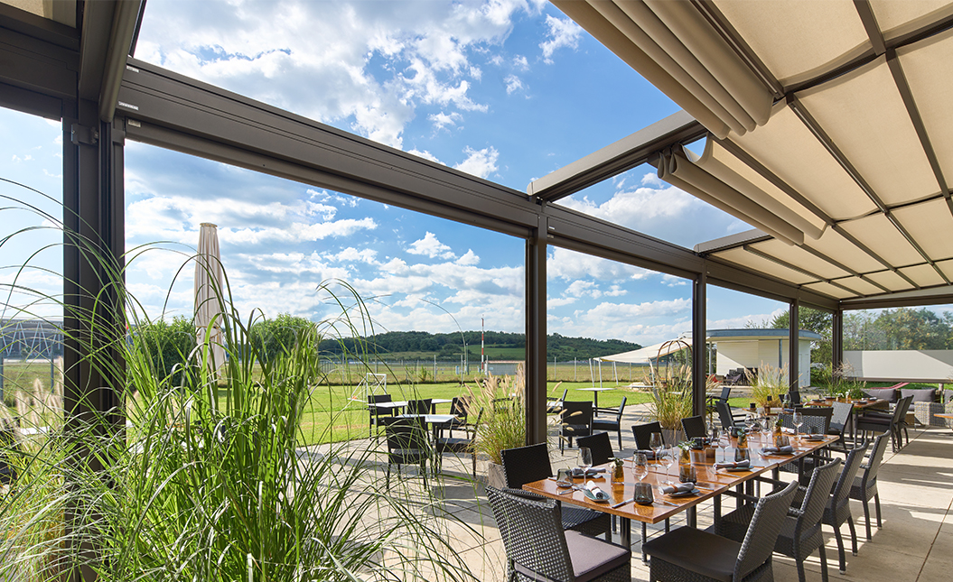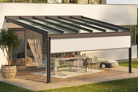 You can protect from the rainfall with 100% waterproof fabrics and fixed glass roof options.